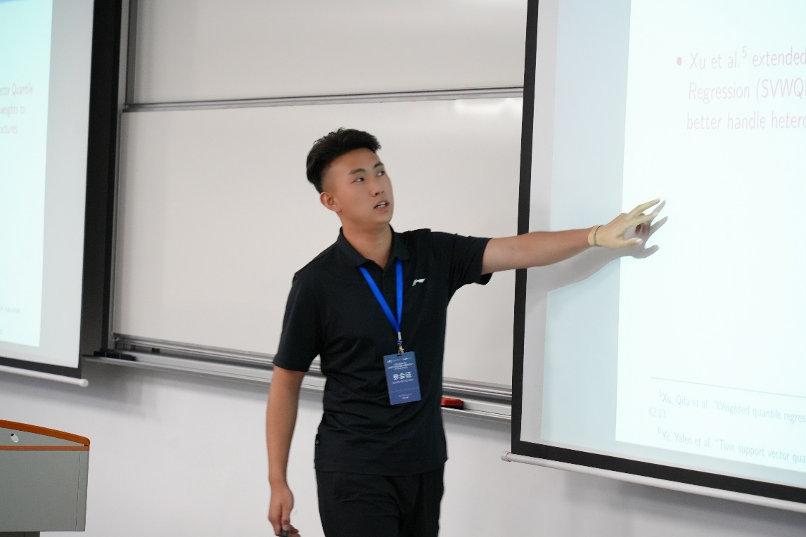 田浩楠同学作了题为《AdaBoost-Enhanced Integrated Learning Framework for Support Vector Weighted Quantile Regression》的报告,提出一种结合AdaBoost动态加权与支持向量分位数回归的集成学习框架,可有效处理异方差和厚尾分布数据,在预测精度、鲁棒性和泛化能力方面均表现出色。