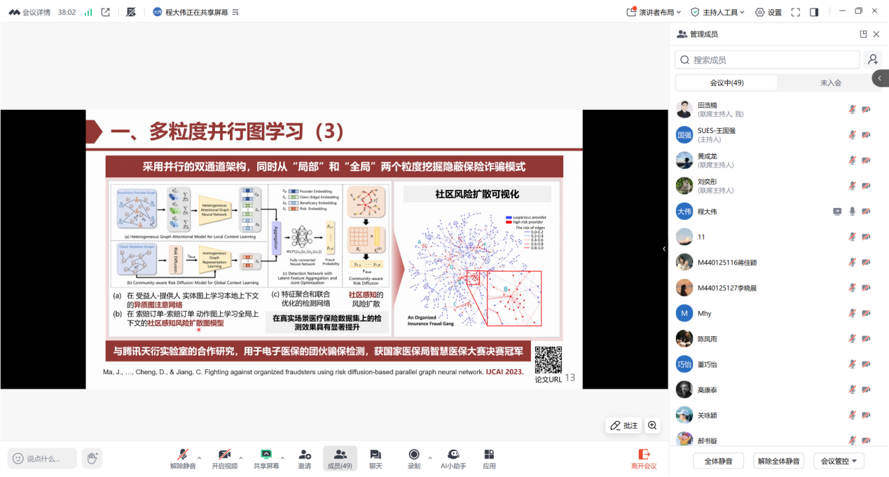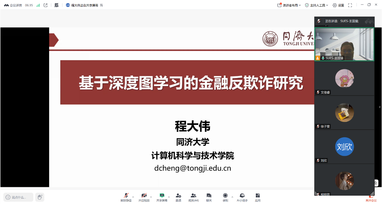 9月11日,同济大学计算机科学与技术学院程大伟教授通过腾讯会议在线开展讲座,以“基于深度图学习的金融反欺诈模型研究”为主题,为学院师生带来一场聚焦前沿技术与金融安全交叉领域的学术盛宴。报告会由800cc全讯白菜网主站院长王国强教授主持。