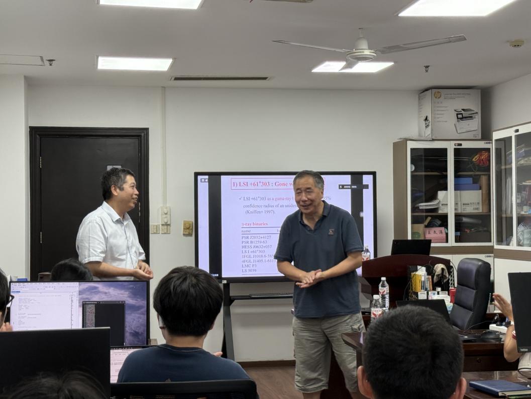 9 月 23 日,中国科学院紫金山天文台刘庆忠研究员在行政楼 1212 室作为师生题为《微类星体的多波段研究》的学术报告。800cc全讯白菜网主站从事物理学、数学、天文学相关领域的教师、硕士研究生参加了本次报告会,报告由800cc全讯白菜网主站伍歆教授主持。