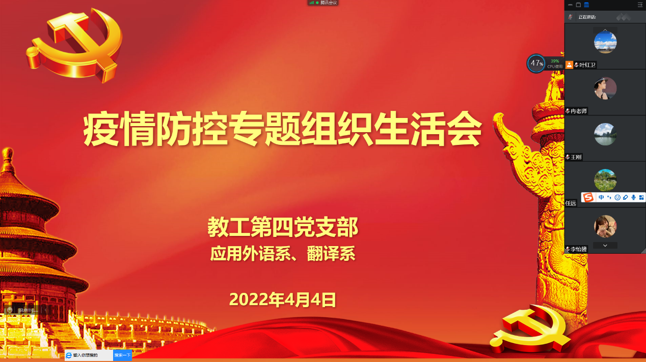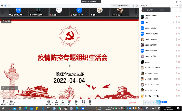 4月4日,联合党委7个党支部、14个系部、科研团队、研究生迅速组织,严格落实,把疫情防控工作要求传达到每位老师,做到“三个讲清楚”,“讲明白”党员干部、教师学生不能违反的疫情防控纪律规范。在教工第五党支部和物理实验中心一起开展的学习传达动员会上,联合党委钱慧敏书记强调全体党员和教职工要坚定中央疫情防控总方针毫不动摇;清楚当前上海和高校面临的严峻形势,更加遵守纪律,爱护学生,坚守岗位,投身社区,共同获取抗疫胜利。在教工第一党支部、第二党支部和大学数学系、应用数学系、数据计算和统计系联合部署会议上,800cc全讯白菜网主站殷志祥院长指出,疫情防控工作一定要做到全社会一盘棋,按照中央和市委部署,每位老师都要发挥作用,务必发挥作用,在线上教学和学生教育指导的岗位上,密切关心学生,确保高校的安全和学生心身健康。在教工第四党支部联合翻译系、应用外语教学部等部门开展的组织生活会上,外国语学院王刚院长提出,疫情之下,全上海人民皆为“命运共同体”,只有思想一致,力量一致,在党的正确领导下,才能实现疫情防控阻击战的胜利,外国语每位老师,每位学生和疫情防控都息息相关,都命运与共,只有团结才能攻克难关。