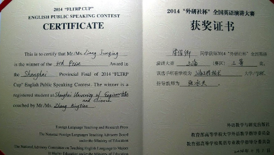 11月1日下午,2014年“外研社杯”全国英语演讲大赛(上海赛区)复赛在复旦大学邯郸校区举行。比赛由外语教学与研究出版社主办,教育部高等学校大学外语教学指导委员会和教育部高等学校英语专业教学指导分委员会合办,复旦大学承办。来自我校和复旦大学、上海交通大学、华东师范大学、东华大学等25所高校的25名英语演讲佼佼者参加了角逐。比赛持续了近六个小时,来自我校机械工程学院的梁俊卿同学荣获三等奖。