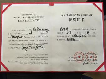 11月1日下午,2015年“外研社杯”全国英语演讲大赛(上海赛区)复赛在上海商学院举行。汽车工程学院的戚本璜同学凭借精彩的演讲、纯正的发音和机智的对答荣获二等奖,创造了我校在该项赛事上的最好成绩。