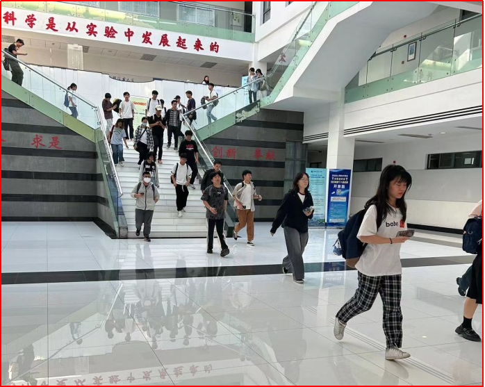 本次演练,物理实验中心负责开展,全体教师思想认识到位,齐心协力,高质量地完成了各项前期准备工作;下午2点40分随着火灾警报的响起,演练正式开始。实训楼二号楼六个实验室正在上课的师生,按照逃生路线,在教师和实验员组成的安全引导员指引下,迅速、有序地跑向就近消防楼梯下楼,向楼外集合点撤离。参加活动的全体师生积极配合圆满完成了消防疏散演练活动,所有参加演习的 90多名学生和10名教职工在60秒内安全撤离到指定集合地点。